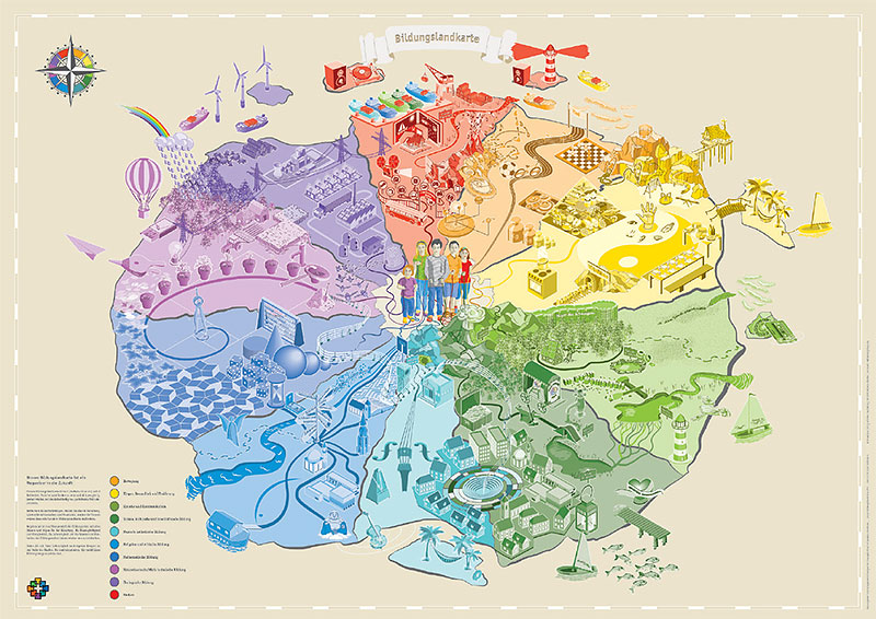 Die Bochumer Bildungslandkarte - entwickelt von Fachberatung und pädagogischen Fachkräften der Kindergartengmeinschaft im Kirchenkreis Bochum - visualisiert die 10 Bildungsbereiche aus den Grundsätzen zur Bildungsförderung in NRW.