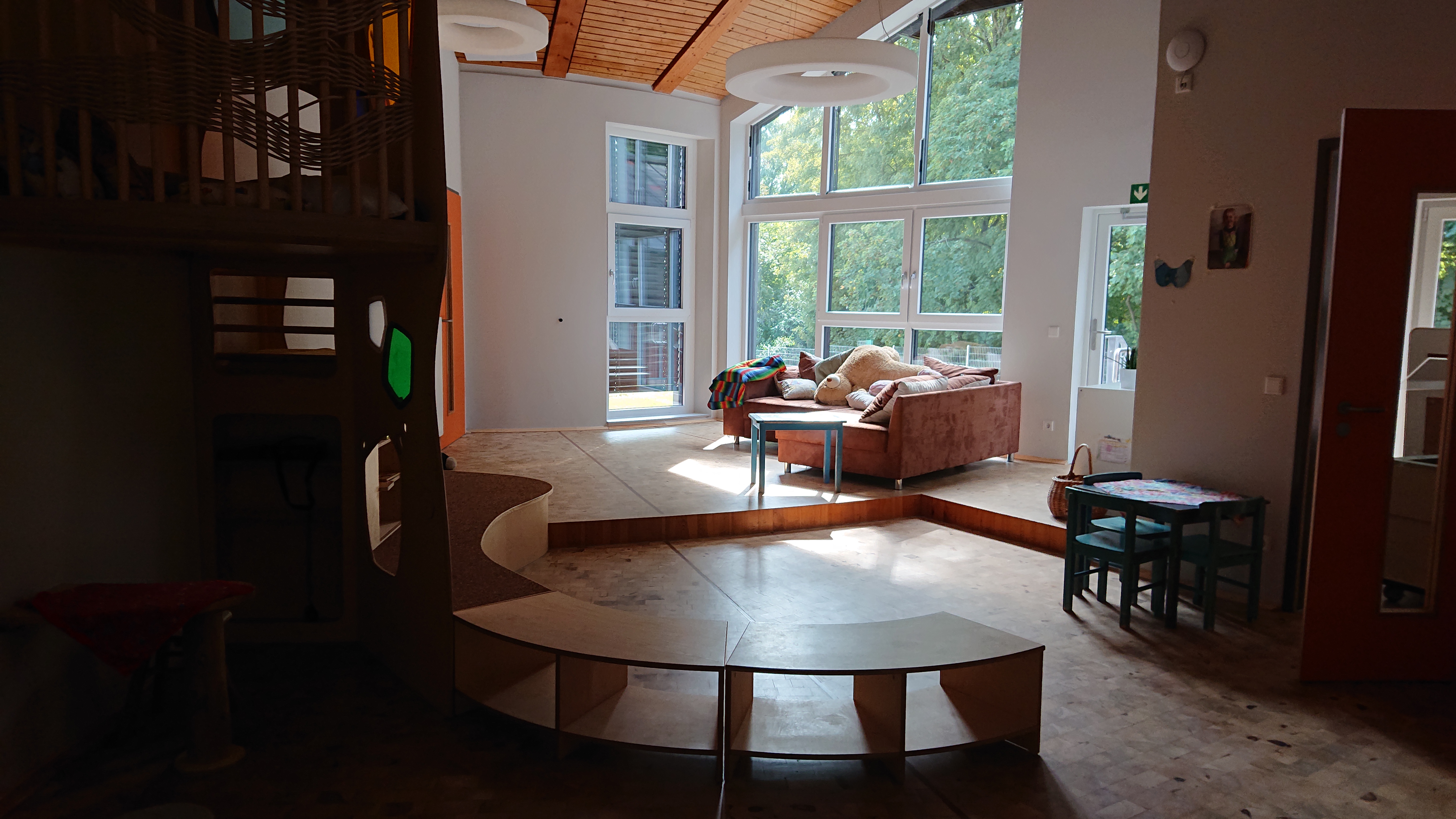 Von der Eingangshalle aus erschließen sich die Gruppen- und Gruppennebenräume, in denen in denen nach dem Offenen Konzept die 10 Bildungsbereiche verortet sind.